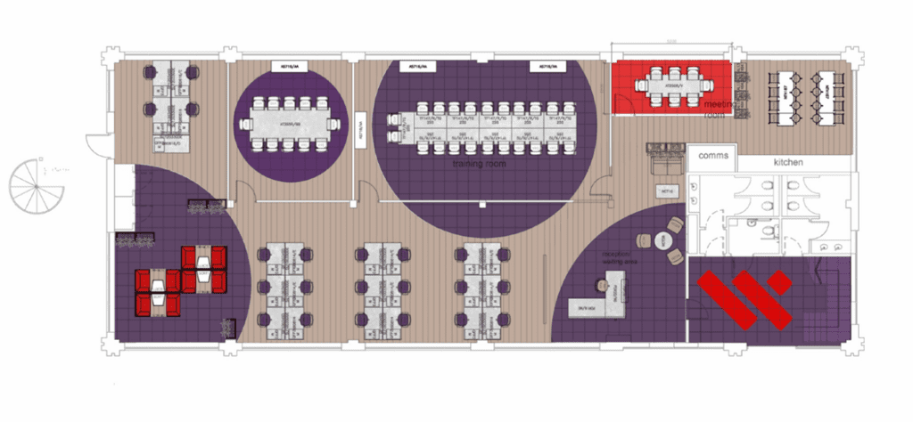 Next, we translated these ideas into 2D layouts. This stage allowed us to map out the space practically, defining zones and workflows to maximize efficiency while staying true to the vision. This 2D design is shows the full idealised vision, and is bespoke to each project. For FourNet, the idea of having segmented zones was important, including a training room, office, meeting area, as well as workstations for staff.